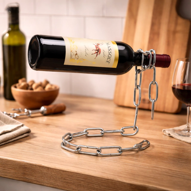 Desafiá la gravedad y sorprendé a tus invitados con este portabotellas único. Gracias a su diseño basado en el equilibrio de pesos, la botella parece quedar suspendida en el aire, sostenida solo por una cadena cromada. Es la pieza perfecta para quienes buscan una decoración con personalidad y un toque de misterio en su mesa o vinoteca.