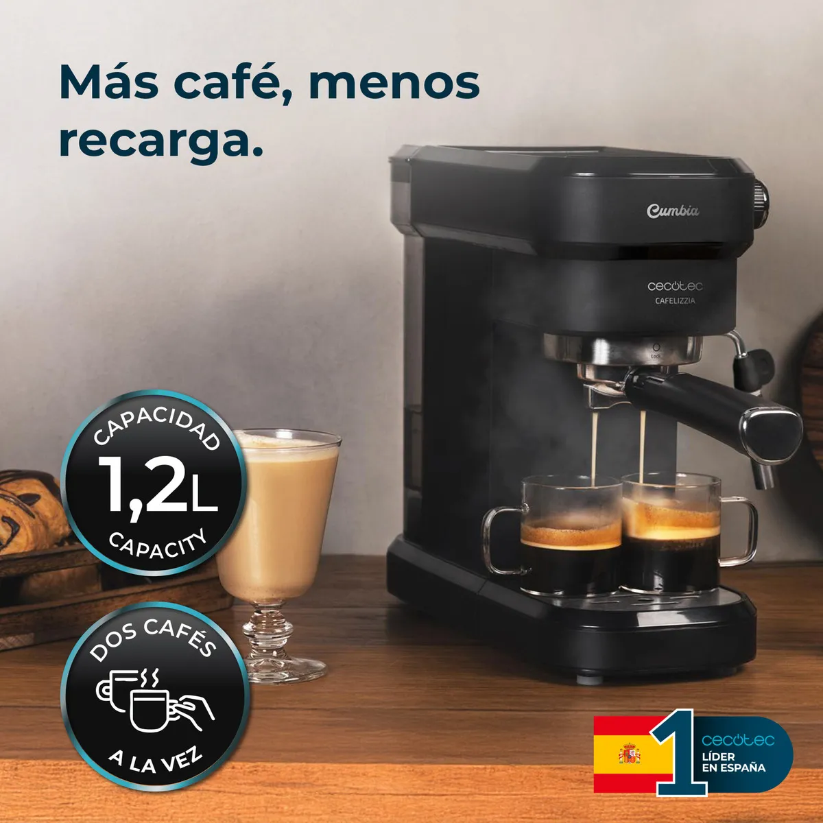 - Brazo portafiltros con doble salida y dos filtros para preparar uno o dos cafés automáticamente.