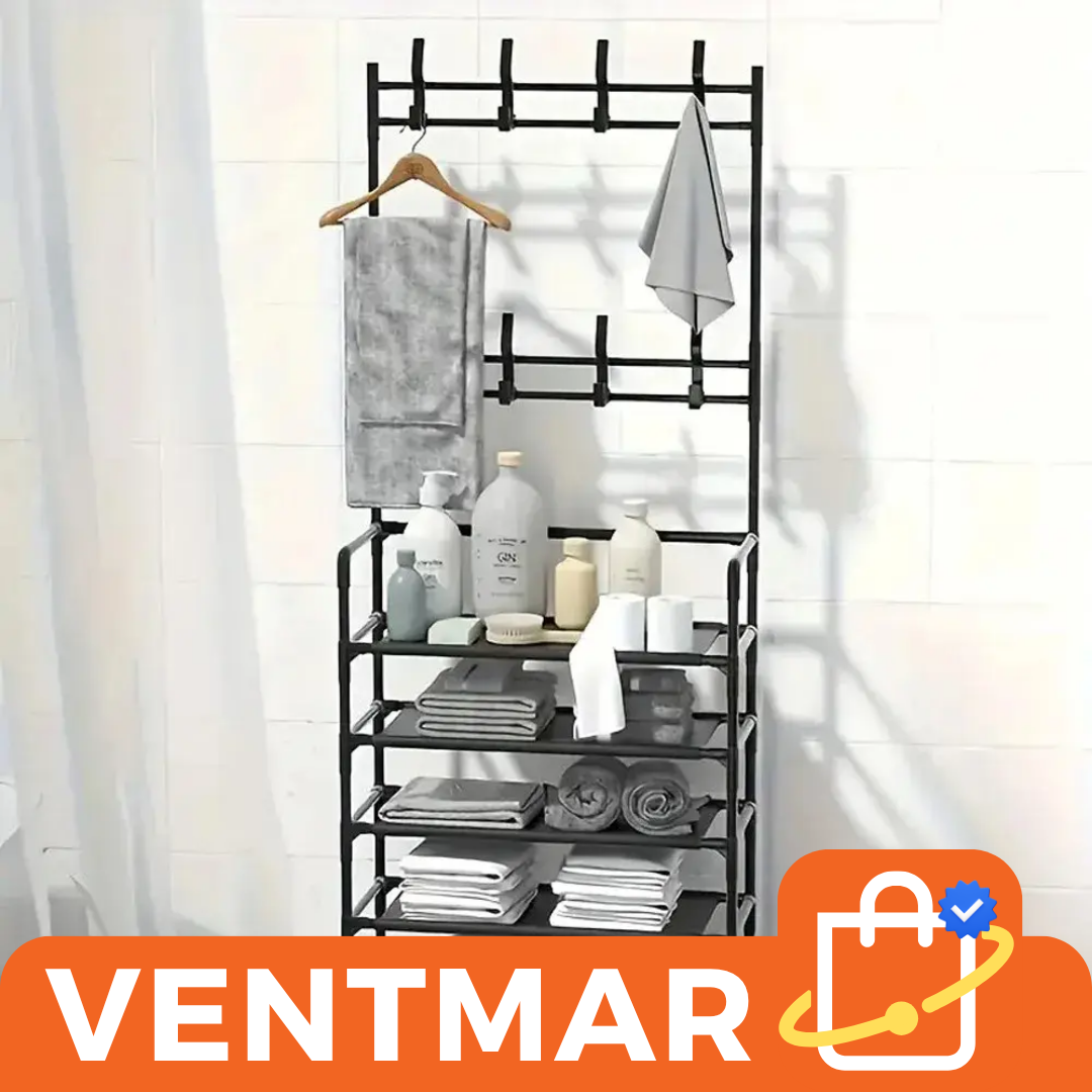 Su diseño moderno con ganchos superiores permite colgar prendas, bolsos o toallas, optimizando cada rincón sin ocupar mucho espacio.