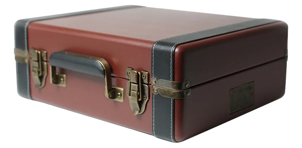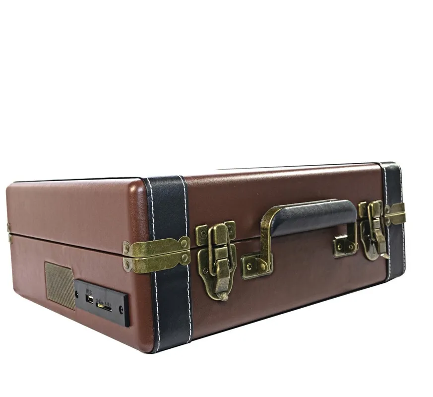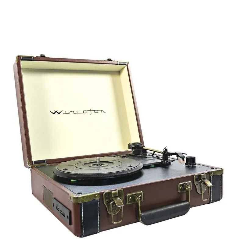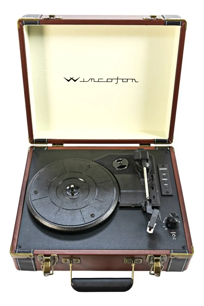 El tocadiscos WINCO permite revivir colecciones de LPs con un toque de nostalgia. Este reproductor de vinilos Vintage incluye dos altavoces estéreo integrados en su elegante carcasa en forma de maleta. La salida RCA posterior permite conectar altavoces externos. Volumen regulable de forma progresiva a través de un botón giratorio. - Marca: Winco - Modelo: W407 - Material: Madera cubierta por cuero - Color: Marrón - Mecanismo de transmisión por correa - Reproduce tres velocidades: 33 / 45 / 78 RPM - Parlantes internos incorporados - Maletín totalmente portable - Detección automática - Graba directo de vinilo a USB - Salida para auriculares - Permite conectar un amplificador o parlante - Potencia: 2W - Entradas: USB, tarjeta SD, AUX, auriculares - Salidas: RCA, auxiliar, auriculares